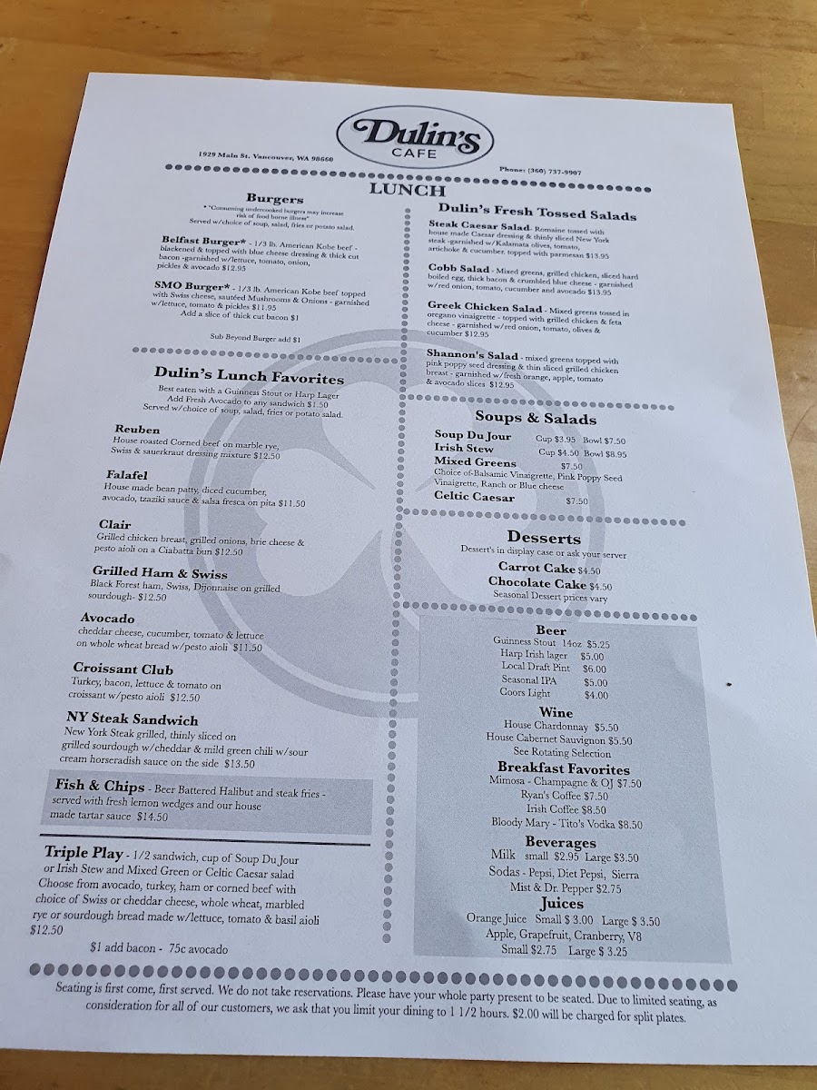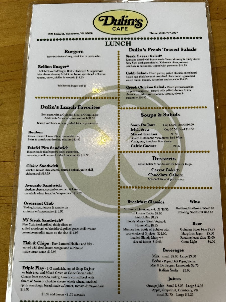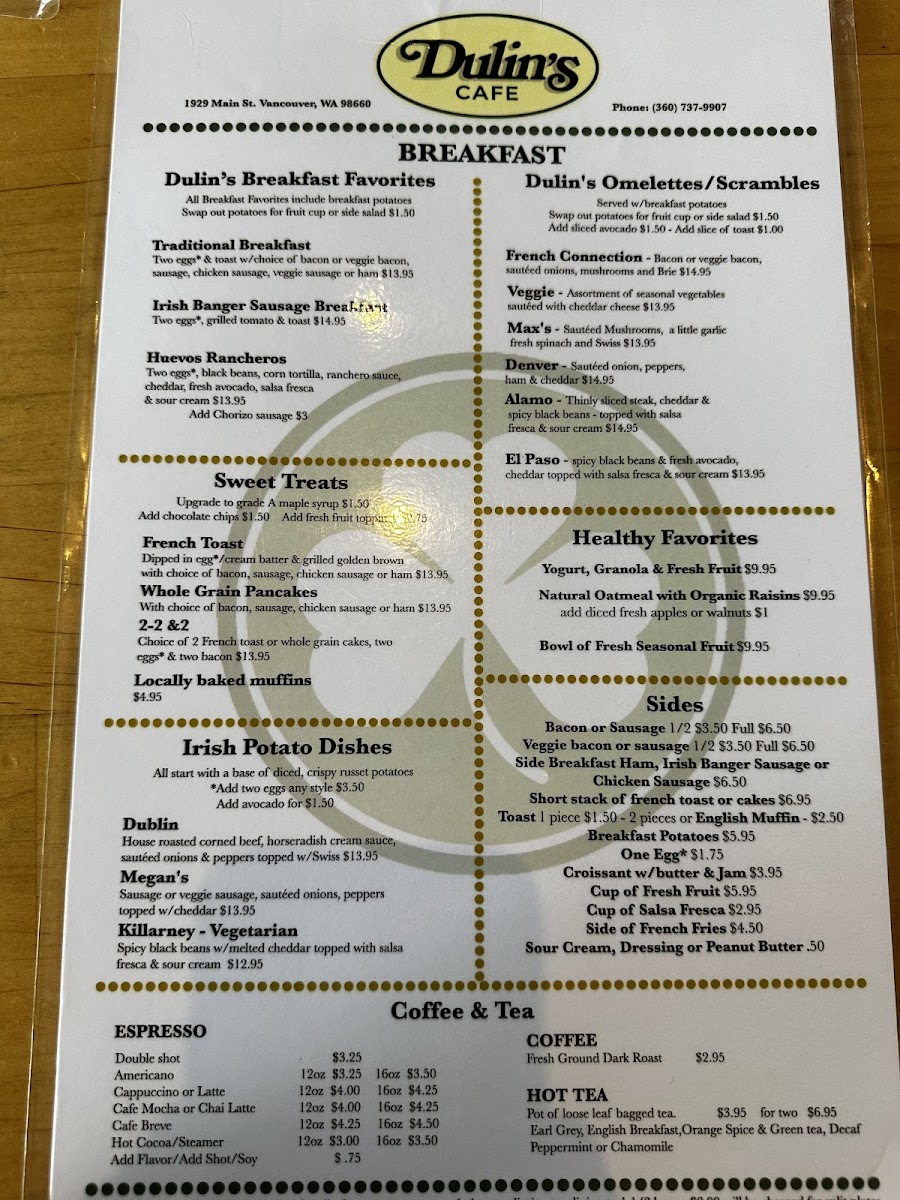 Welcome to Dulin's Village Cafe, where every dish tells a story of flavor and tradition. Nestled at 1929 Main St in Vancouver, WA, our menu is a celebration of culinary favorites that will delight your palate. Whether you're craving a hearty French Connection Omelette to kickstart your morning or the vibrant flavors of our Huevos Rancheros, we have something for everyone. Don't miss our famous Strawberry and Blueberry Waffles paired with a refreshing Mimosa to elevate your brunch experience. For lunch, the Greek Chicken Salad and NYC Steak Sandwich promise to satisfy your midday hunger, while our comforting Corned Beef Hash or Irish Potato Breakfast with Sausage will surely warm your soul. Every bite at Dulin's is crafted with care and a sprinkle of love, so come on by and let us serve you a plateful of our specialties that you'll be dreaming about long after your visit!