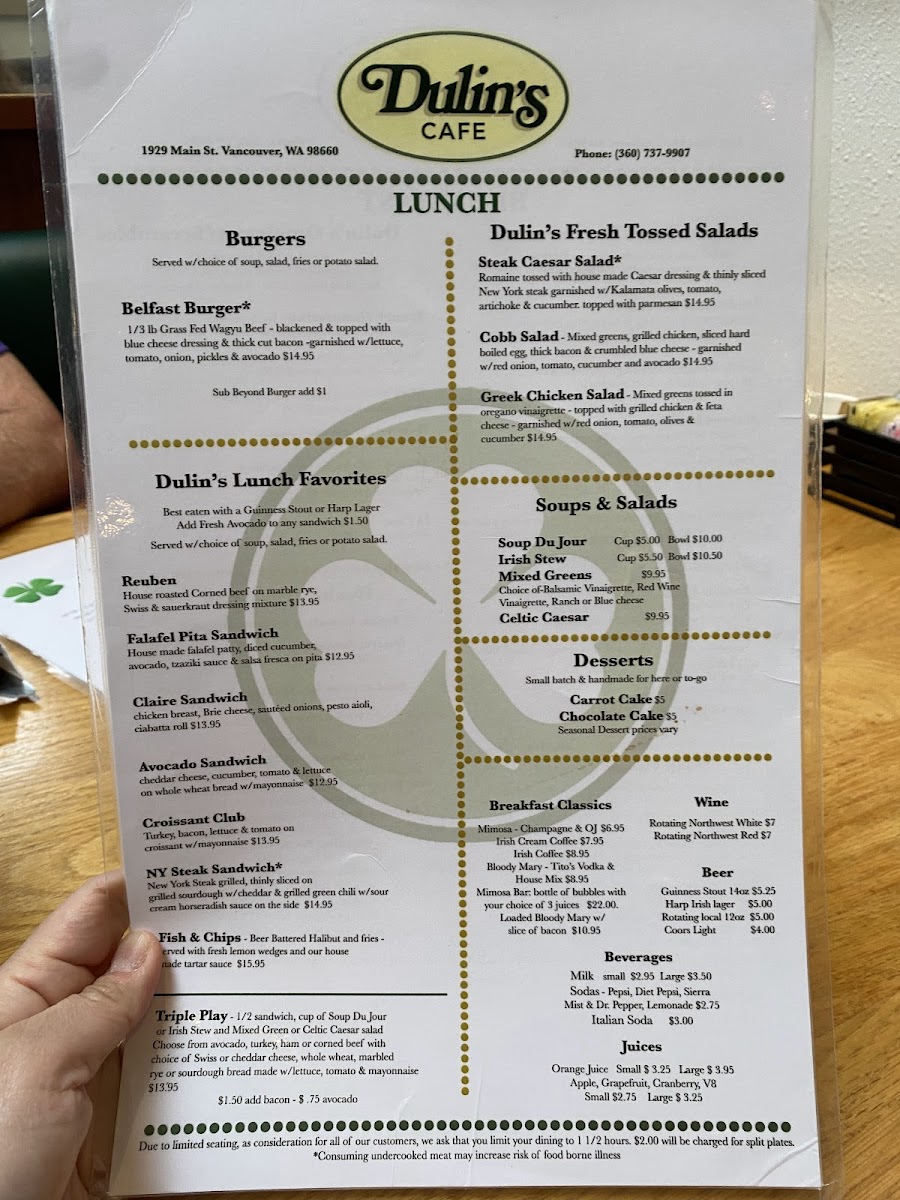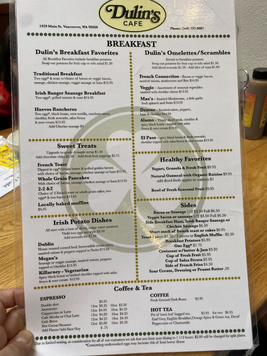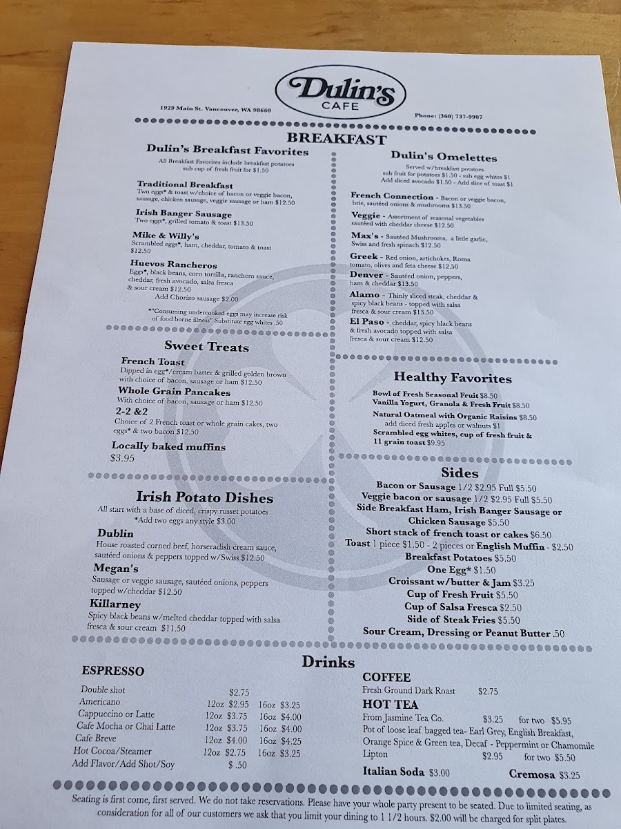 Welcome to Dulin's Village Cafe, where every dish tells a story of flavor and tradition. Nestled at 1929 Main St in Vancouver, WA, our menu is a celebration of culinary favorites that will delight your palate. Whether you're craving a hearty French Connection Omelette to kickstart your morning or the vibrant flavors of our Huevos Rancheros, we have something for everyone. Don't miss our famous Strawberry and Blueberry Waffles paired with a refreshing Mimosa to elevate your brunch experience. For lunch, the Greek Chicken Salad and NYC Steak Sandwich promise to satisfy your midday hunger, while our comforting Corned Beef Hash or Irish Potato Breakfast with Sausage will surely warm your soul. Every bite at Dulin's is crafted with care and a sprinkle of love, so come on by and let us serve you a plateful of our specialties that you'll be dreaming about long after your visit!